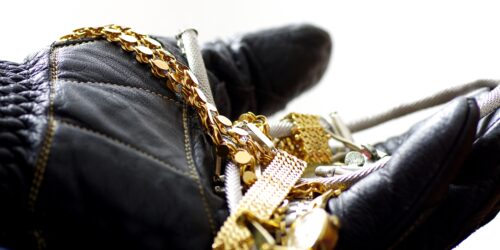Einbrecher hält Diebesgut in Hand mit Lederhandschuh
